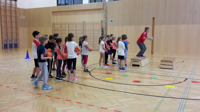 In der heutigen Turnstunde hatten die SchülerInnen der 1B einen  besonderen Gast. Eine Handball Trainerin von den Perchtoldsdorf Devils.  Da machte das Hineinschnuppern in eine neue Sportart gleich noch mehr  Spaß und alle waren mit Feuereifer dabei!