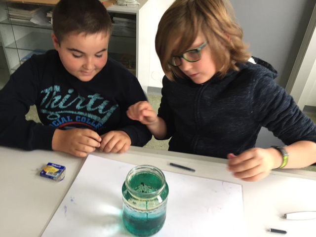 Die SchülerInnen der 1c haben im Unterrichtsgegenstand Science ausprobiert, ob sich Öl und Wassermischen lassen. Als sie erkannten, dass Öl auf dem Wasser schwimmt, haben sie bunte Tinte durchdas Öl ins Wasser sickern und damit interessante Farbenspiele entstehen lassen.