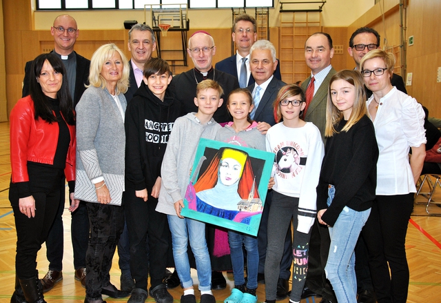 Brunn/Maria Enzersdorf durch Weihbischof Franz Scharl.Empfangen wurde er mit einem Bild der Hl. Kunigunde, der Schutzpatronin von Brunn, von denSchülerinnen und Schülern, von Brunns Pfarrer Adolf Valenta, Direktorin Silvia Weginger,Brunns Vizebürgermeister Gerhard Feichtner, Religionsfachinspektor Herbert Vouillarmet, MariaEnzersdorfs Bürgermeister Johann Zeiner, Brunns Bürgermeister Andreas Linhart, DiakonWolfgang Kommer und Religionslehrerin Brigitte Worscha (v.l.).