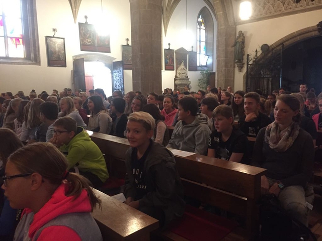 Am Freitag der ersten Schulwoche trafen sich die Schülerinnen und Schüler aller christlichen Konfessionen in der Pfarrkirche Brunn am Gebirge zur gemeinsamen Wortgottesfeier zu Schulbeginn. Diakon Wolfgang Kommer, der vielen auch als Religionslehrer bekannt ist, und der evangelische Pfarrer Markus Lintner leiteten die Feier. Vor Beginn fand sich spontan einerseits eine Gruppe unter den Kindern und Jugendlichen, die als Chor die ausgewählten Lieder begleiteten und andererseits einige, welche Kyrierufe und Fürbitten vortrugen.
