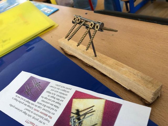 "Das KANN doch gar nicht funktionieren!" Zumindest haben das die meisten SchülerInnen der 2b und 2d gedacht, als die Hausübung zum Thema Gleichgewicht ausgeteilt wurde. Dennoch haben sich alle mit großem Eifer daran gemacht, die Versuche mit einfachsten Hilfsmitteln, die jede(r) daheim hat, nachzubauen und später in der Klasse zu präsentieren. Und siehe da ... es ging doch. Durch geschicktes Verlagern des Schwerpunktes balanciert der Schmetterling auf der Fingerspitze, halten die Nägel oder Schrauben ganz ohne Kleber in ihrer Postition und tanzen die Bleistifte. Coole Sache!