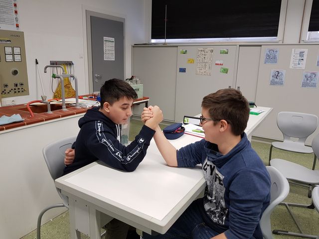 Die Erforschung physikalischer Kräfte muss nicht unbedingt langweilig sein. Wir haben dabei auch unsere Kräfte erprobt und versucht, mit einem kleinen Wettbewerb im Armdrücken herauszufinden, wer der oder die Stärkste in der Klasse ist. Alle waren mit Feuereifer und vollem Krafteinsatz dabei!