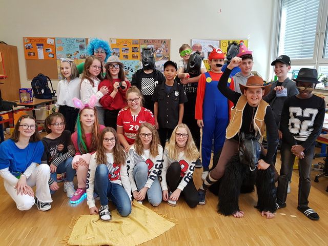 Was tun am Faschingsdienstag? Alle Jahre wieder dieselbe Frage. Für die 2b war klar: es muss eine Party sein. Alle haben etwas mitgebracht, alle haben sich eine Verkleidung ausgedacht. Für Spaß war gesorgt, für Spiele und Musik sorgte Frau Mortinger und natürlich Jack, the Chicken.