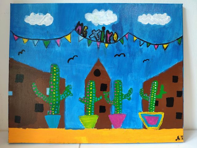 Unter der Anleitung von Frau Scheer entwickelt die 3c wahre künstlerische Talente. Seien es die Weihnachtskarten, die am Tag der Offenen Tür zu Gunsten der 'Roten Nasen' verkauft wurden, oder die Acrylbilder zum Thema Frieda Kahlo und Mexiko, es sind richtige Kunstwerke. Dank der neuen Bilderschienen können diese auch gut präsentiert werden. Natürlich war die 3c auch am Tag der Offenen Tür wieder kreativ. Da standen Portraits in Folk Art und eine Plane für einen Zeichenwettbewerb auf dem Programm.