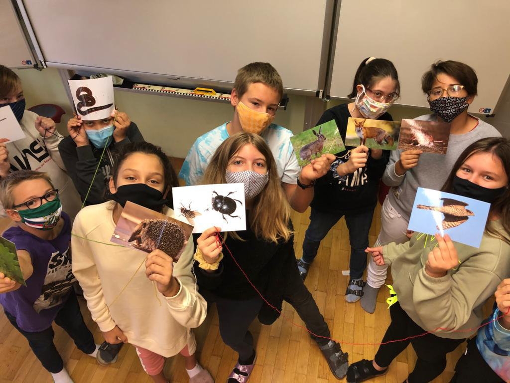 In Biologie hat die 2a zum Thema Ökosysteme verschiedene Nahrungsketten erarbeitet und daraus ein Nahrungsnetz gebildet, wie es in einem Wald vorkommen kann. Besonders anschaulich wurde dieses komplexe System durch Wollfäden und Bilder dargestellt.