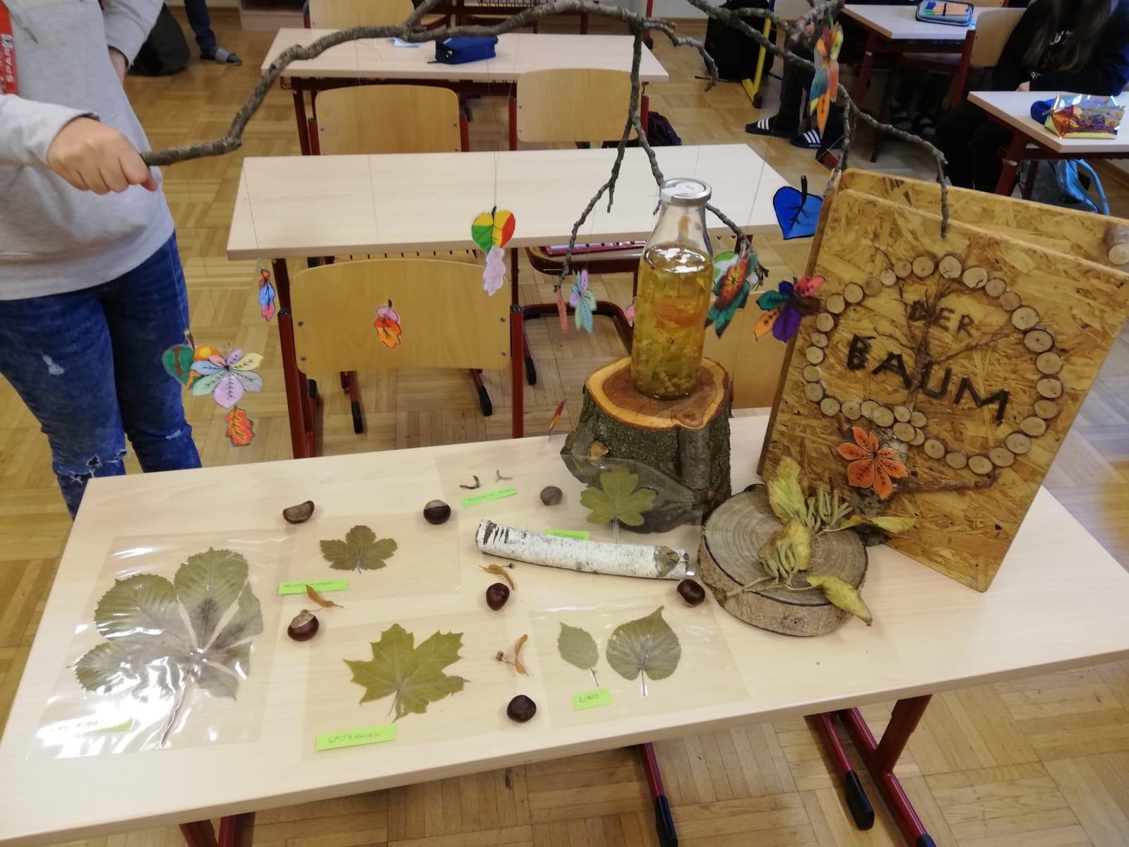 Im Oktober lernten die Schülerinnen und Schüler der 2c die einheimischen Laub- und Nadelbäumen besser kennen. Jahresringe von Baumplatten wurden abgezählt, die Rinde abgetastet, selbstgemachter Tee mit Ahornblüten gekostet und Blätter den Bäumen zugeordnet. Die Schülerinnen und Schüler zeigten großes Interesse.