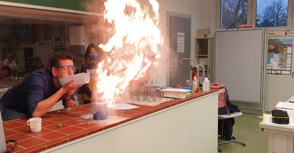 Im Experiment wurde eine kleine Menge Mehl (2 Teelöffel) auf ein Blatt Papier aufgetragen und dieses anschließend gleichmäßig in die Flamme eines Gasbrenners gepustet.