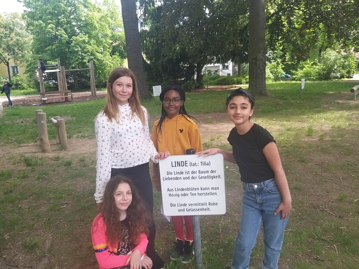 Die 1a stärkt in einem Stationenbetrieb zum Thema Bäume und deren Photosythese ihre Klassengemeinschaft. Die Linde ist der Baum der Geselligkeit und die Schülerinnen und Schüler genießen das Lernen im Freien ohne Maske und miteinander.