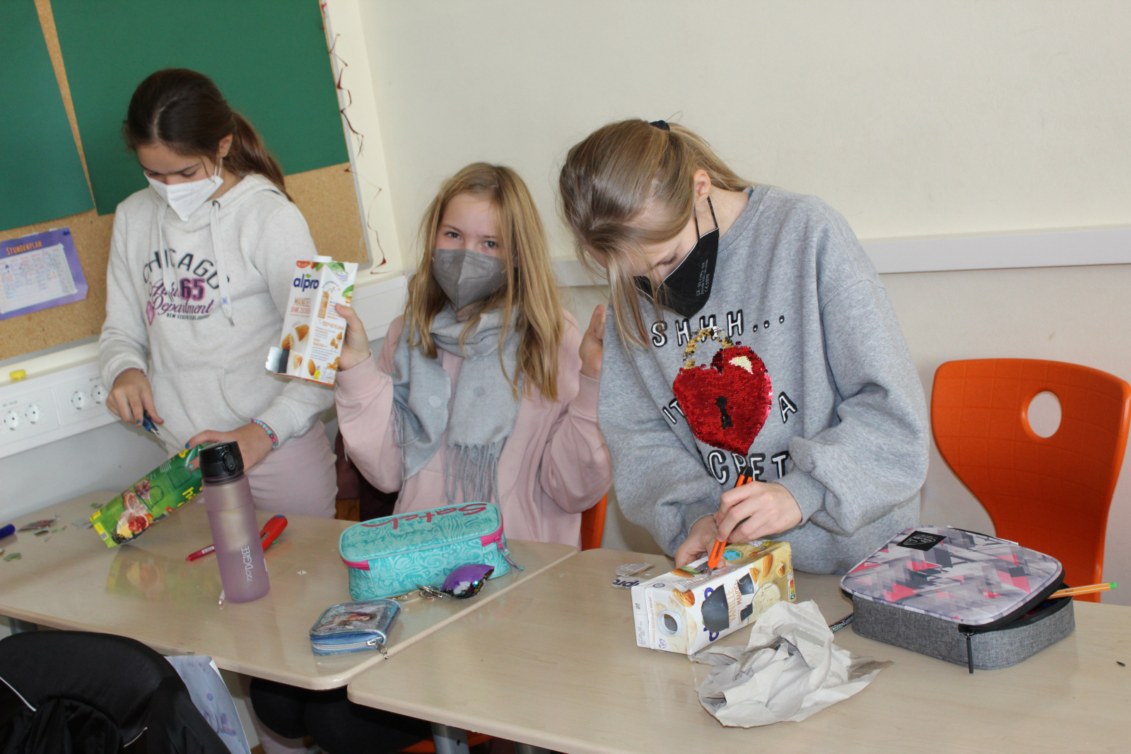 Im Zuge des Projekts 'Gesunde Schule' wurden mit der 2B und 2D recycelte Winterhäuser gestaltet. Dazu verwendeten die Kinder leere Milchkartons und bemalten diese mit schwarzer Acrylfarbe. Fenster und Türen wurden eigenständig ausgeschnitten und anschließend mit weißer Farbe 'dekoriert'.