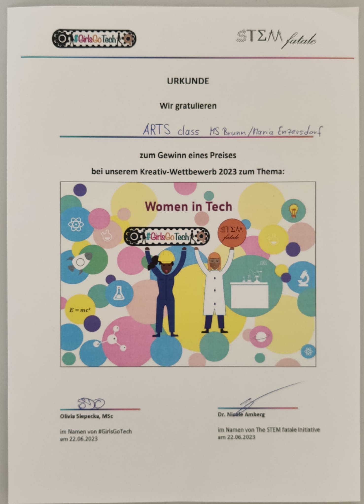 Noch eine weitere Urkunde ist gerade eben bei uns eingetrudelt: die Siegerurkunde des Kreativ-Wettbewerbs "Women in Tech".