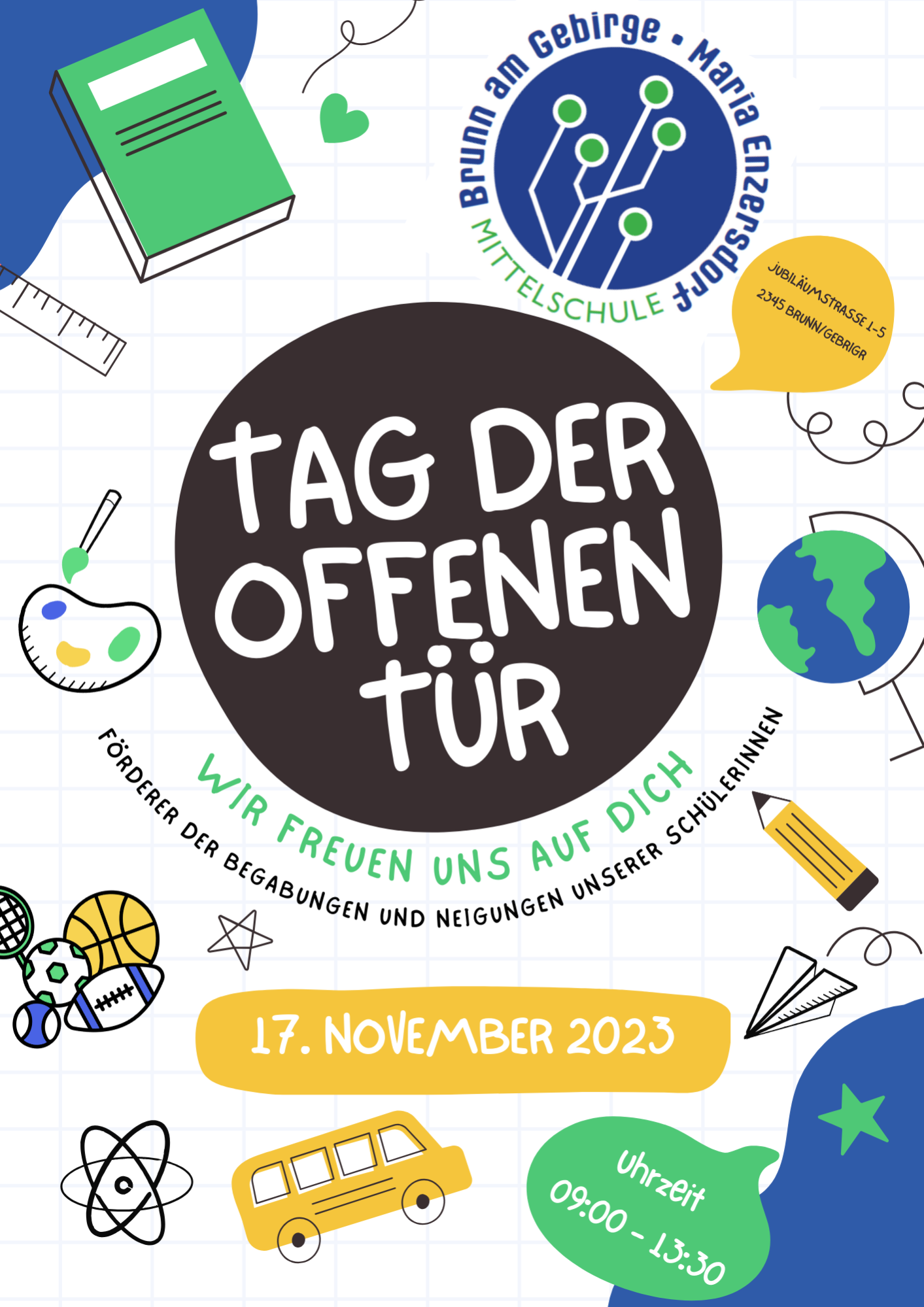 Unser Tag der offenen Tür findet heuer am Freitag, 17.11.2023 in der Zeit von 9-13.30 Uhr statt. Wir bieten ein buntes Programm aus 'normalem' Unterricht und einzelnen Stationen, die ein bißchen zeigen, wie vielfältig das Angebot an der MS Brunn/Maria Enzersdorf ist. Unsere Großen werden Sie gern durchs Haus führen und alle Ihre Fragen beantworten. Den Folder mit dem genauen Ablaufplan können Sie unten downloaden!