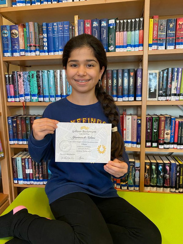 Afarinesh S. ist nach Philipp B. die zweite Schülerin der MS Brunn/Maria Enzersdorf, die im Jahr 2023 den Preis und das Zertifikat des Goldenen Bücherwurm-Clubs gewonnen hat.