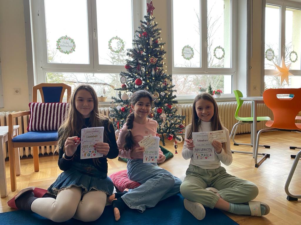Um auch in der Bibliothek die Zeit bis zum Christkind zu verkürzen, gab es wie im Jahr zuvor einen Leseadventkalender. Täglich wurde ein Teil einer Fortsetzungsgeschichte mit einer Frage zum Inhalt im Schulhaus ausgehängt. Die richtige Antwort brachte den Schülerinnen und Schülern einen Stempel in ihrem Adventpass ein. Wer sich alle 24 Stempel geholt hatte, bekam zur Belohnung einen HÜ-Gutschein für ein Fach seiner Wahl. Und den haben sich einige geschnappt!