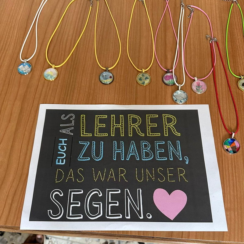 Als großes Dankeschön für ihr Engagement und ihre Unterstützung haben die Lehrer der 4. Klassen von den Viertklässlern selbstgemachte Carbonketten und Schlüsselanhänger mit einzigartigen, selbstdesignten Aquarellmotiven erhalten.