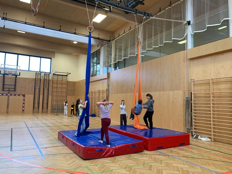 In Arts wurden Herbstblätter mit Hilfe von Chromatographie gebastelt, im Labor wurde die geheimnisvolle Maschine erforscht und Papierhelikopter gebastelt, in Robotik konnten die Baukästen ausprobiert werden. In der Küche wurden Obstspieße und Mandarinen-Kürbisse hergestellt und in der Turnhalle durfte die Air-Track-Matte ausführlich getestet werden.
