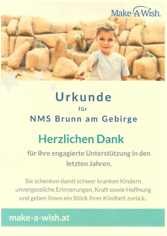 Wie auch in den vergangenen Jahren hat unsere Schule heuer am „Make a Wish“-Lauf teilgenommen. Alle 12 Klassen waren mit großem Einsatz jeweils 15 Minuten lang in Etappen unterwegs. Dank der großzügigen Spenden von Eltern, Großeltern und weiteren Unterstützer:innen konnte auch dieses Jahr wieder ein beachtlicher Betrag gesammelt werden.