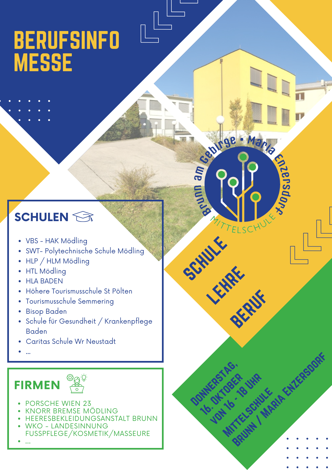 Mehrere höhere Schulen sowie regionale Firmen stellen sich vor und geben spannende Einblicke in ihre Ausbildungswege, Angebote und Berufsfelder. So können sich unsere Jugendlichen direkt vor Ort beraten lassen, Fragen stellen und erste Kontakte für ihre weitere Laufbahn knüpfen.