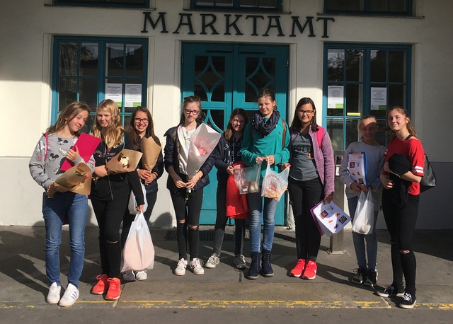 Die Schülerinnen der Wirtschaftsgruppe der 3a machten gemeinsam mit ihrer Lehrerin Kerstin Praher im Zuge des Faches Ernährung und Haushalt am 4.10.2017 eine Exkursion zum Wiener Naschmarkt. Bei strahlendem Sonnenschein konnte die Gruppe den Naschmarkt mit allen Sinnen kennenlernen. Beim Bearbeiten der Arbeitsaufträge entdeckten sie unter anderem exotische Früchte, Gewürze und orientalische Spezialitäten, die sie auch bei einigen Ständen verkosten konnten. Besonders begeistert waren die Mädchen vom Geschmack und der Vielzahl an getrockneten Früchten. In der nächsten Kochstunde werden dann die am Naschmarkt eingekauften Lebensmittel zum Thema "Orientalische Küche" verarbeitet.
